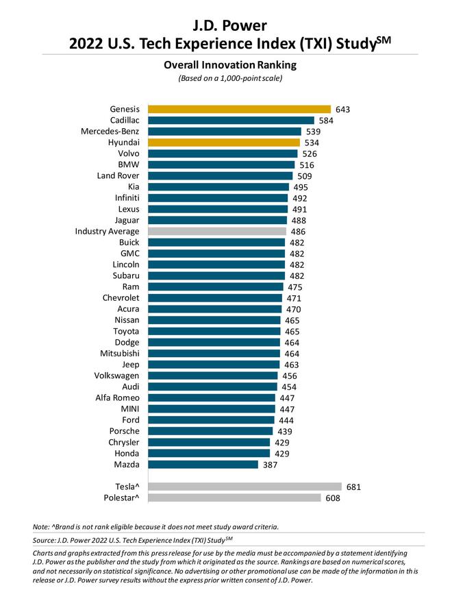在JD Power的创新榜单中,Genesis以最高荣誉领跑榜单,而特斯拉因客户数据未公开而未能获奖。现代在众多普通汽车品牌中表现卓越,力压沃尔沃、宝马和路虎等豪华车品牌。通用集团旗下的凯迪拉克紧随其后,排名第二,别克和GMC分别排在第三和第四位,紧随现代和起亚之后。这一发现表明,不同汽车企业在技术革新领域的投入和产出有着明显的不同。